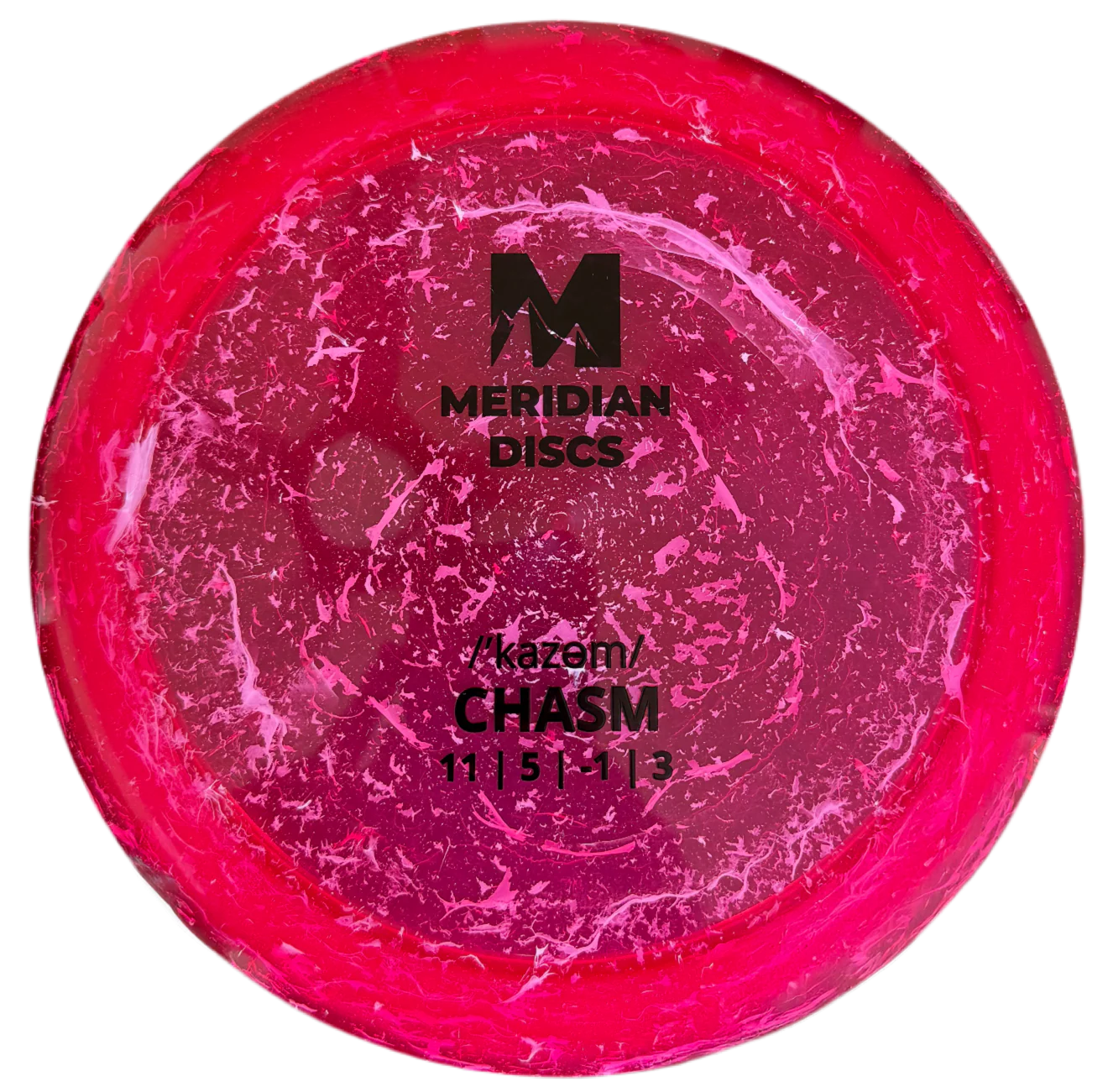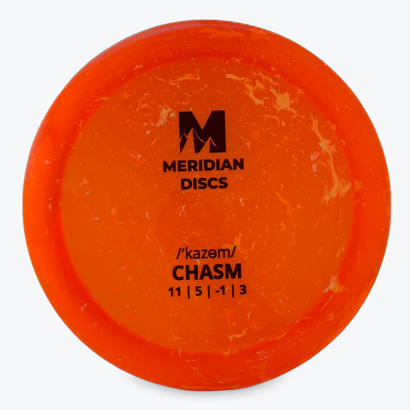 The Chasm is an overstable Speed-11 distance driver by Meridian Discs that offers a nice crossover between control and distance and can handle powerful throws to provide a little turn before the dependable end-fade.