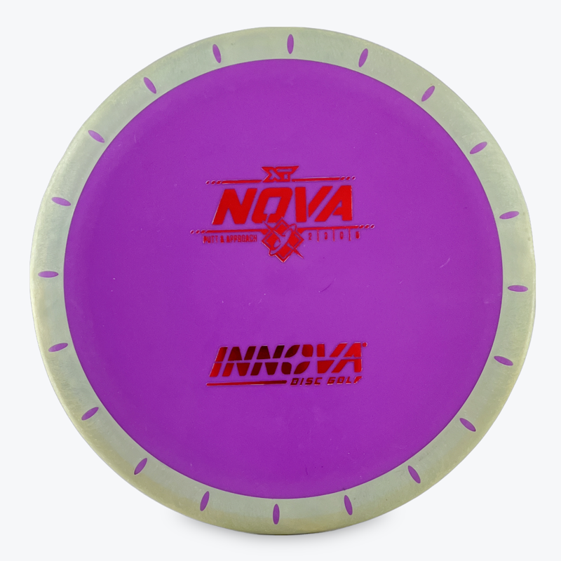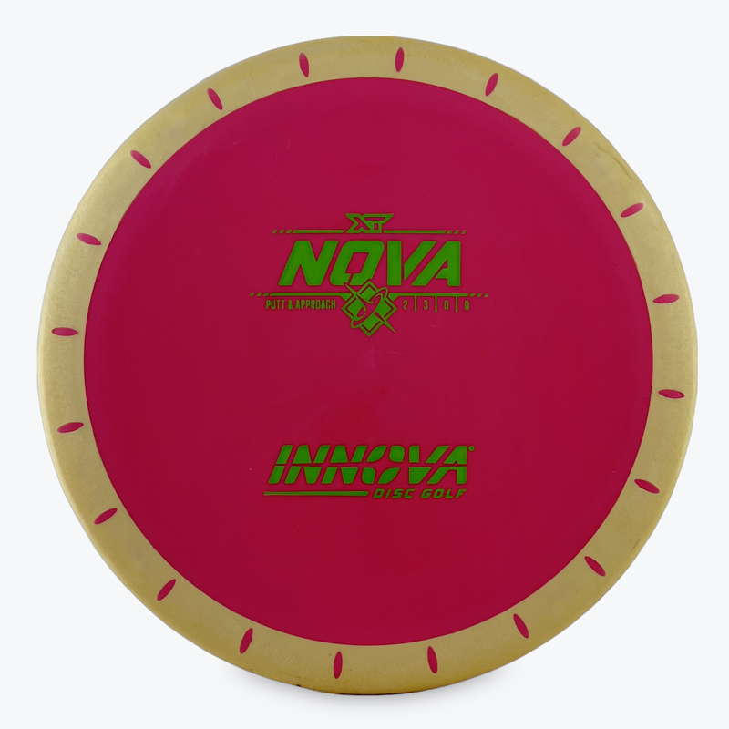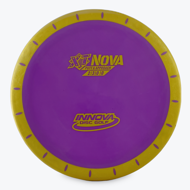 The Innova Nova, a straight-flying Aviar type putter, that utilizes two different plastic blends to provide a unique flight and feel. The outer rim consists of a very soft grippy plastic that grabs the chains. The inner flight plate is firm, but tacky. This tall, two-piece putt and approach disc is described as having the high-speed stability of the Big-Bead Aviar with minimal low-speed fade. It’s the perfect finesse disc that can handle the power of “modern players”, while providing precision accuracy. The unique thing about the Innova Nova compared with other over-mold discs is that it has slits approximately one inch apart throughout the rim.